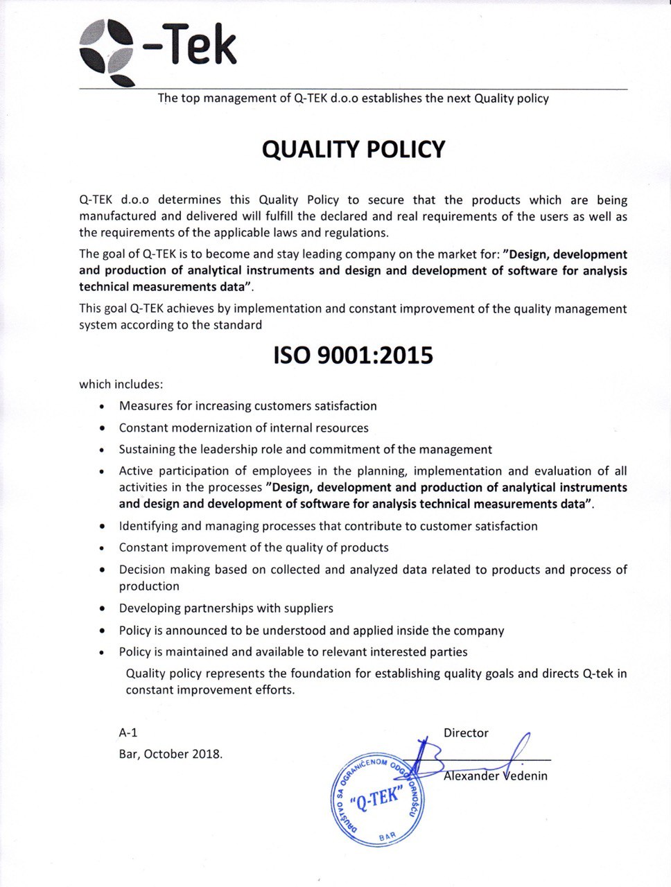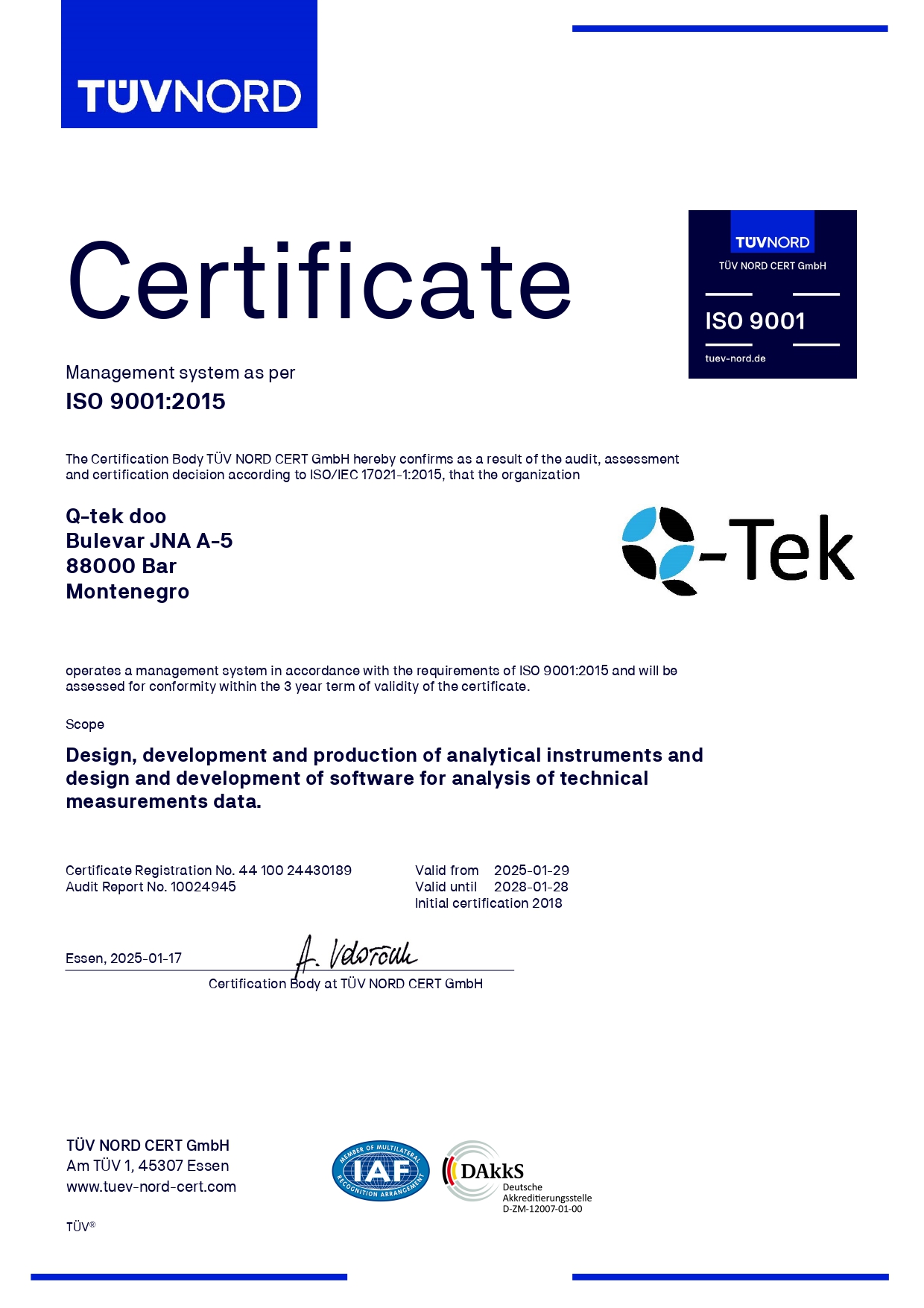 Q-tek applies Quality Management System certified according to ISO9001:2015